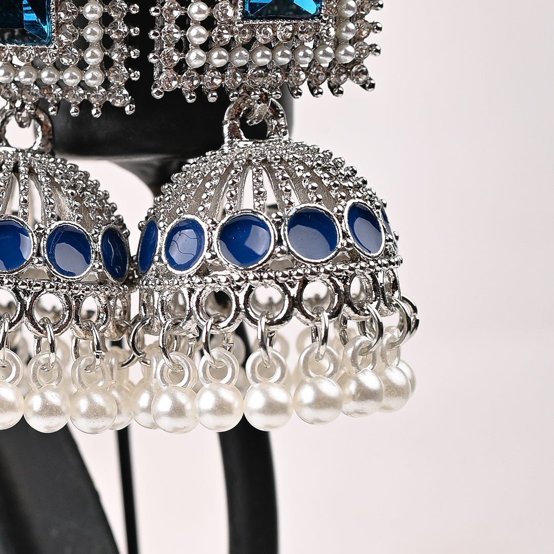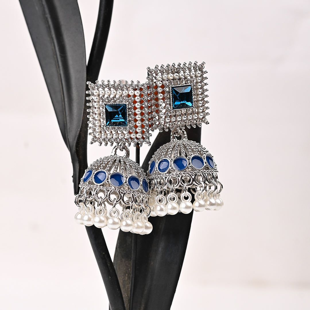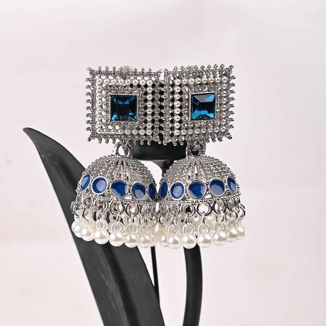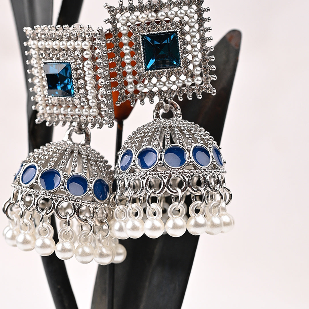 Classic Jhumki Earrings. Beautifully crafted with an antique silver finish, sparkling stones, and a cascade of white pearls. Elevate any ethnic or party look instantly.