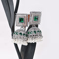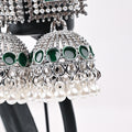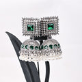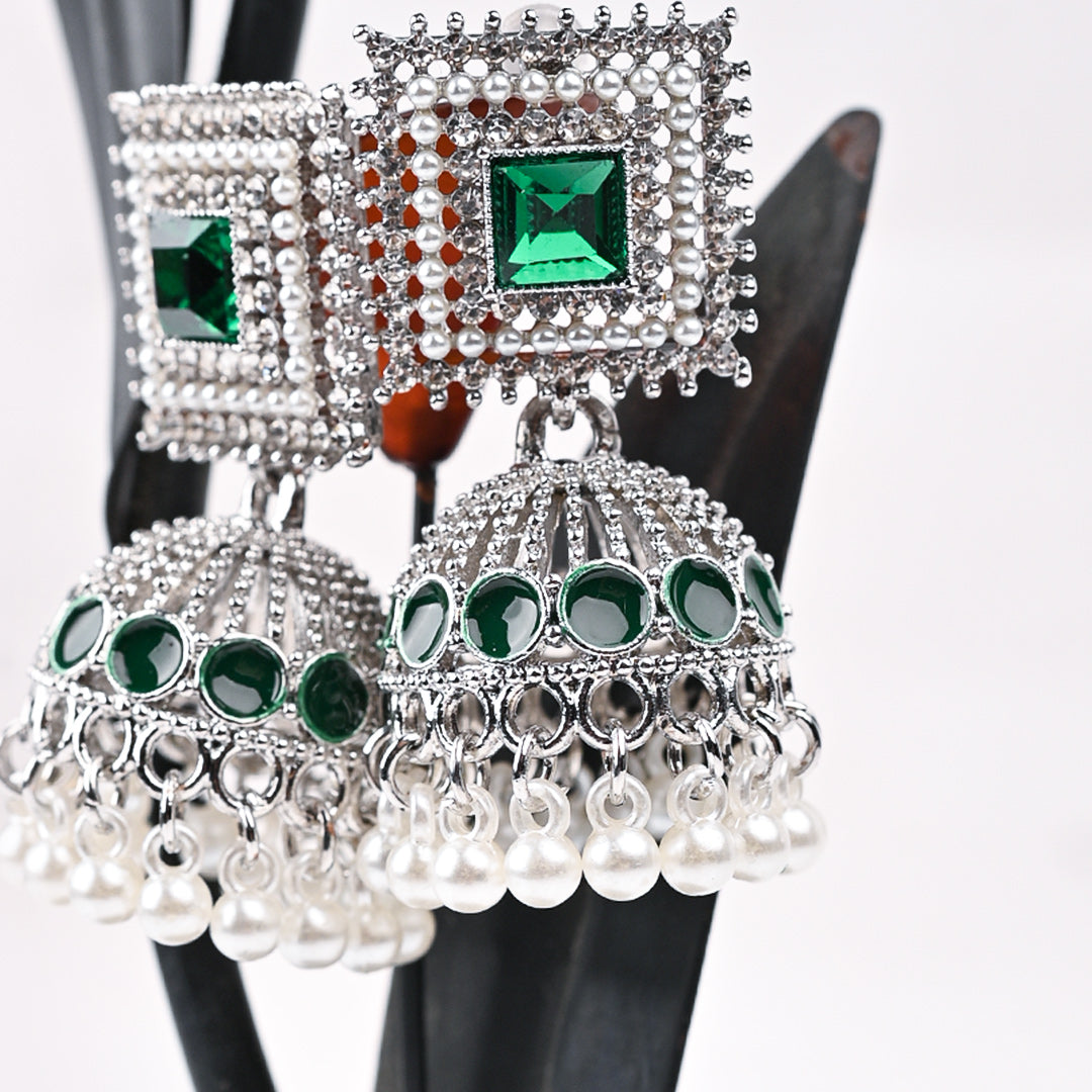 Classic Jhumki Earrings. Beautifully crafted with an antique silver finish, sparkling stones, and a cascade of white pearls. Elevate any ethnic or party look instantly.