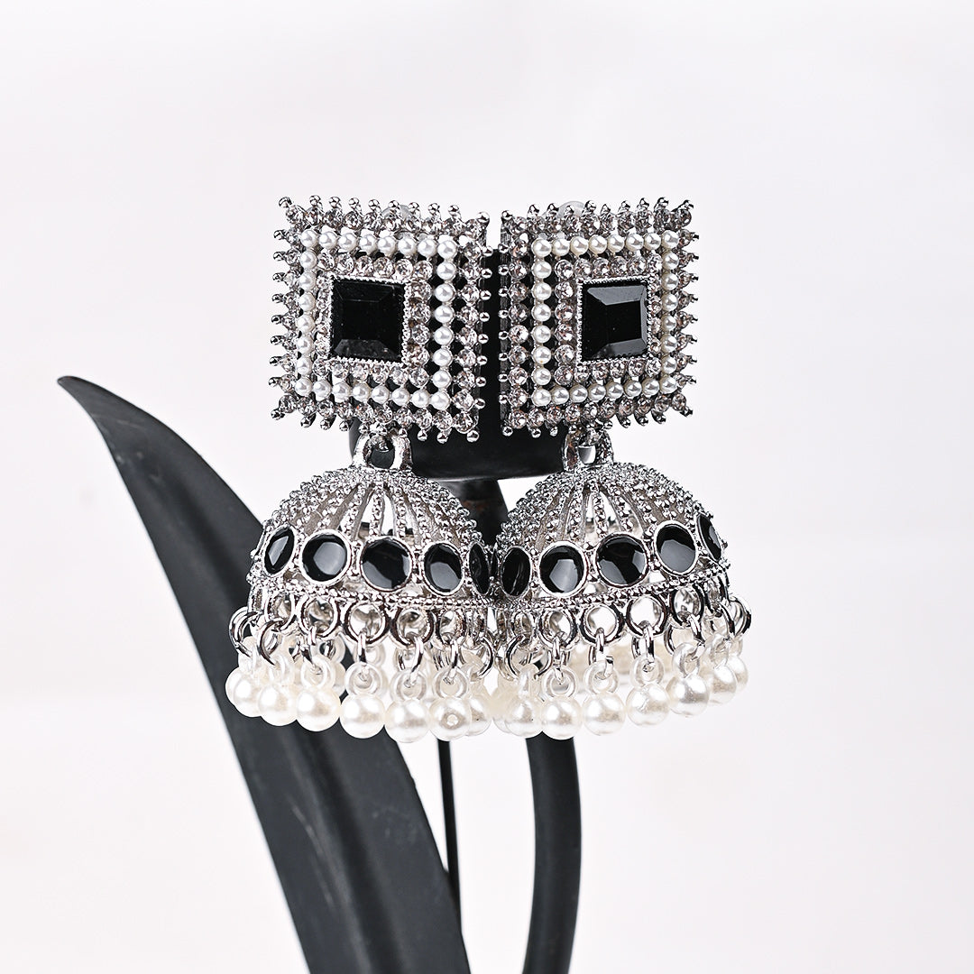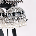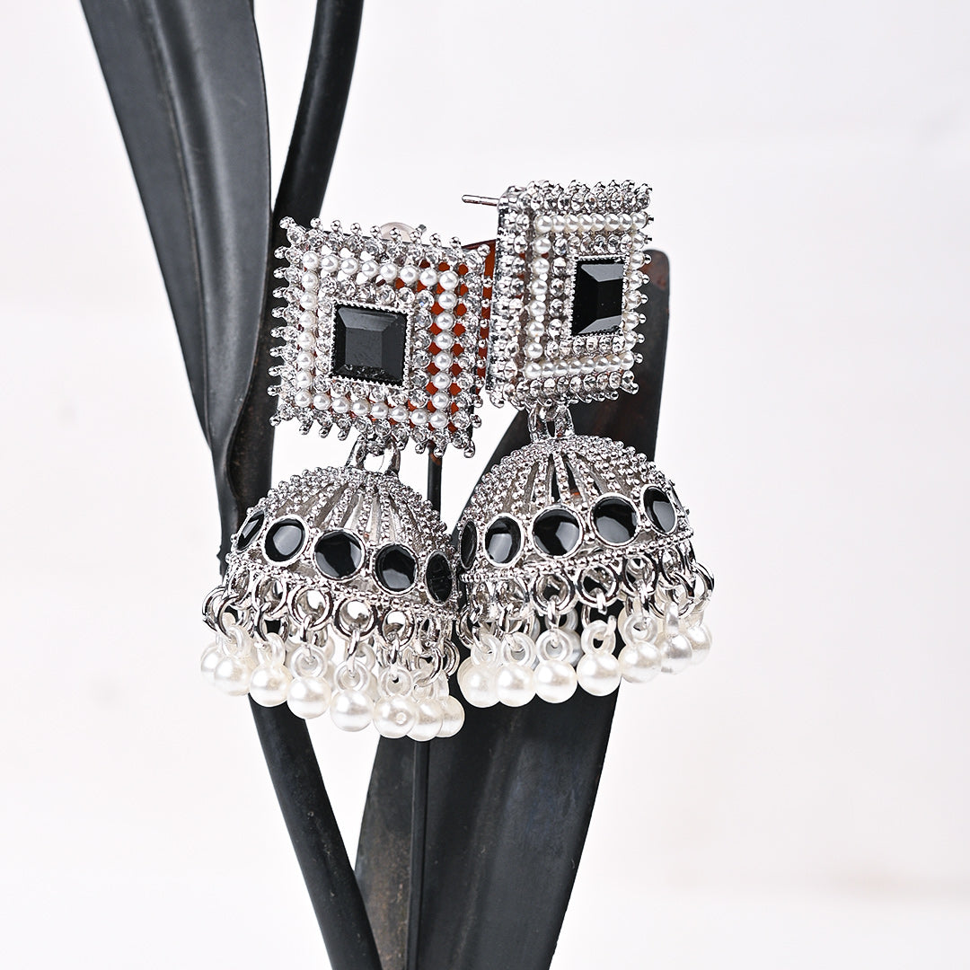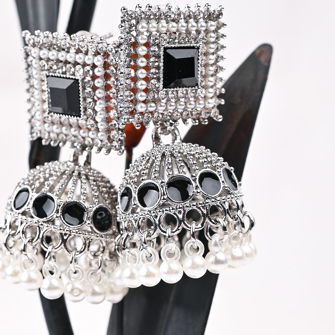 Classic Jhumki Earrings. Beautifully crafted with an antique silver finish, sparkling stones, and a cascade of white pearls. Elevate any ethnic or party look instantly.