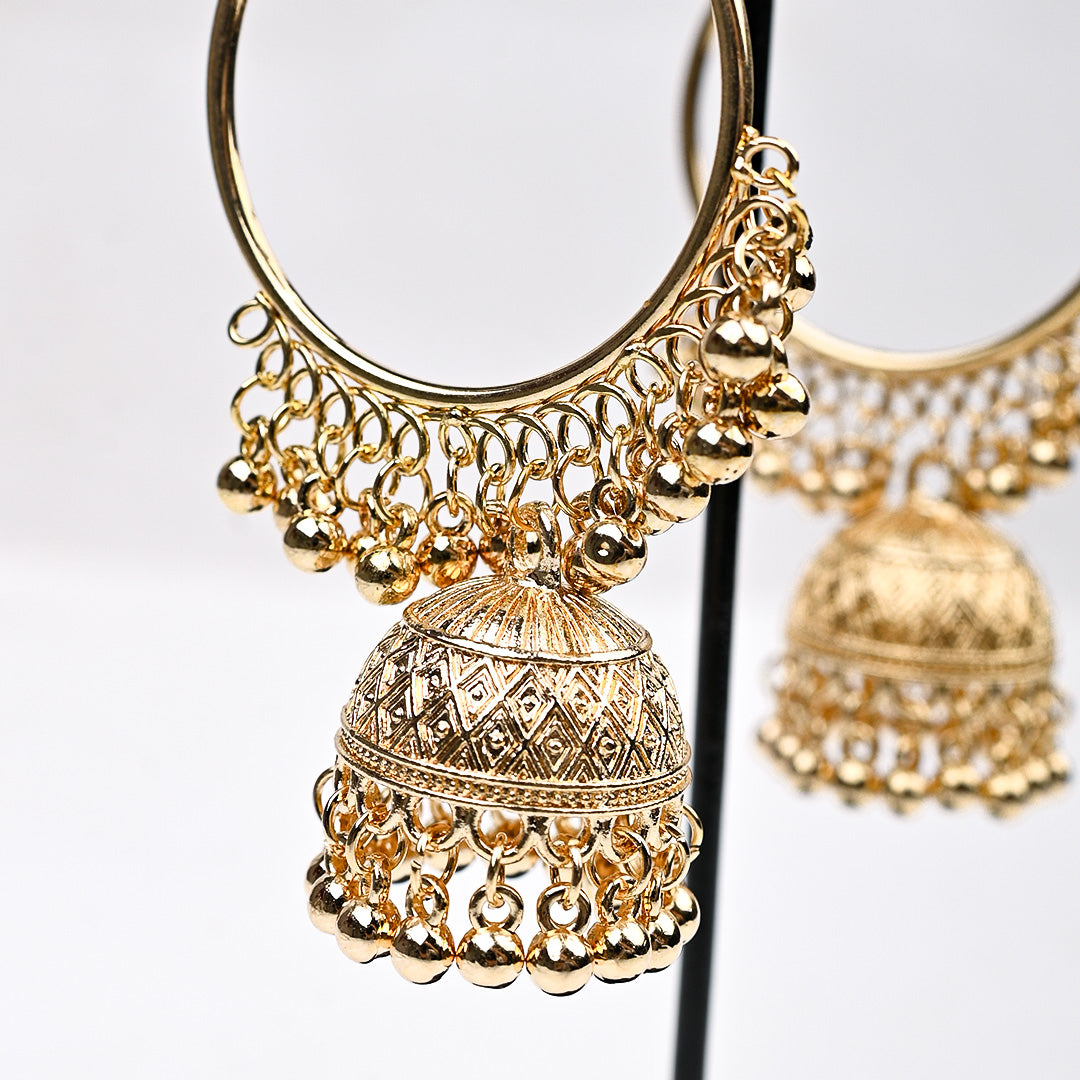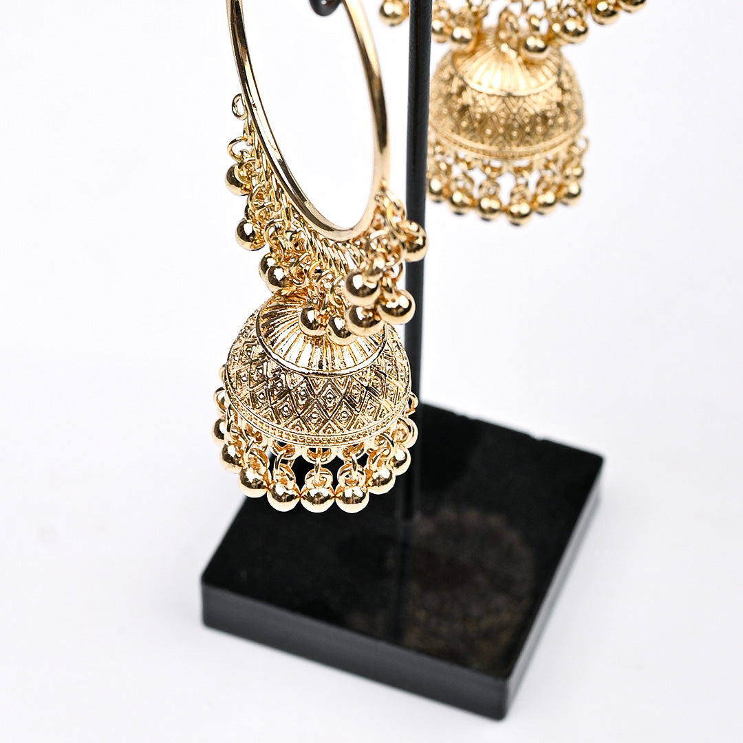 Classic Jhumki Earrings. Beautifully crafted with an antique silver finish, sparkling stones, and a cascade of golden pearls. Elevate any ethnic or party look instantly.